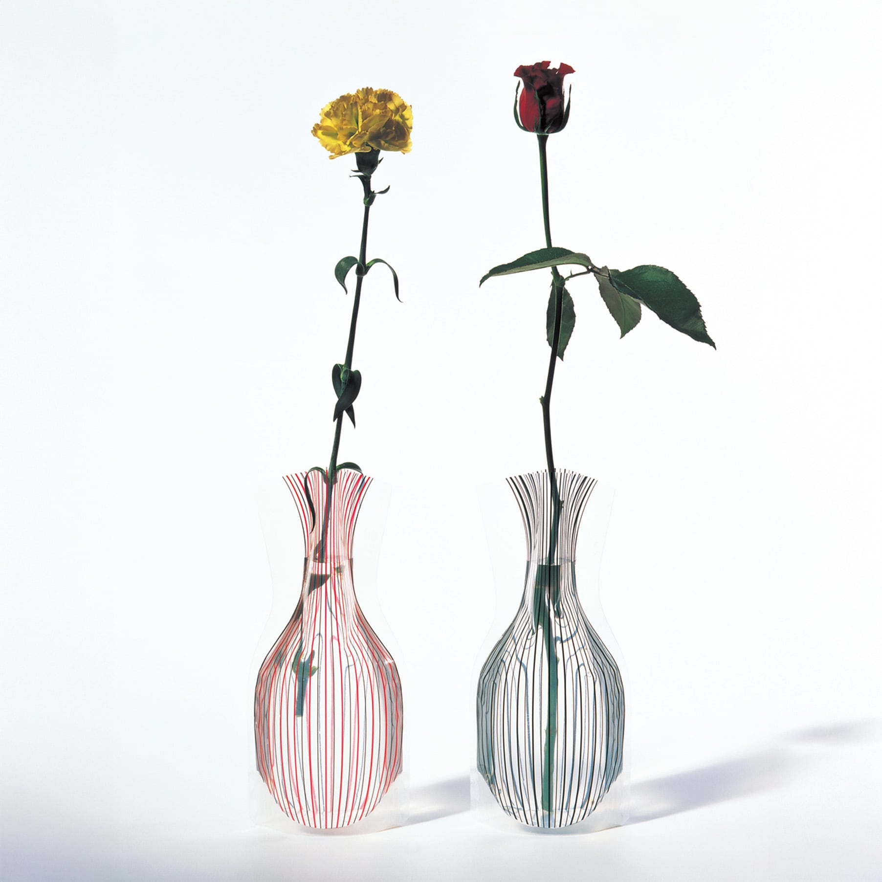 シンプルな線のデザイン。立体的な花瓶に見えるよう線の太さや形にこだわりました。一見すると何気ないビニールパックのようですが、水を入れるだけで美しい花びんに変身する、ビニール製の花瓶です。水を入れた時の光の屈折が美しく、割れることもないため安全で、折りたたむと場所をとらずに収納できます。