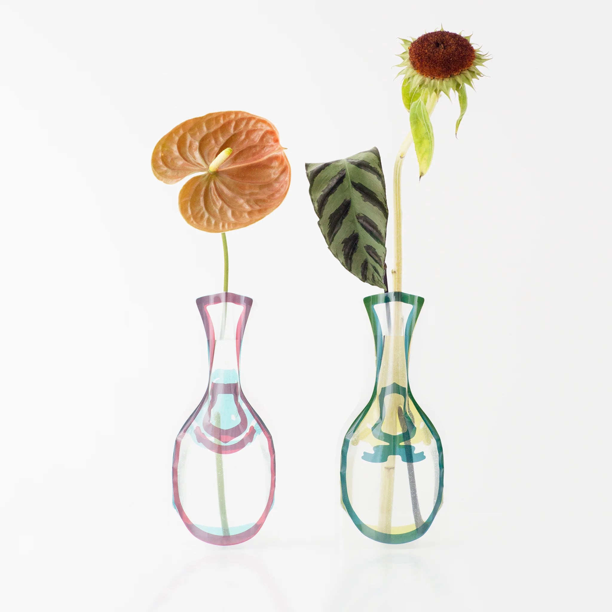一見すると何気ないビニールパックのようですが、水を入れるだけで美しい花びんに変身する、ビニール製の花瓶です。水を入れた時の光の屈折が美しく、割れることもないため安全で、折りたたむと場所をとらずに収納できます。