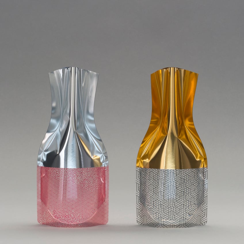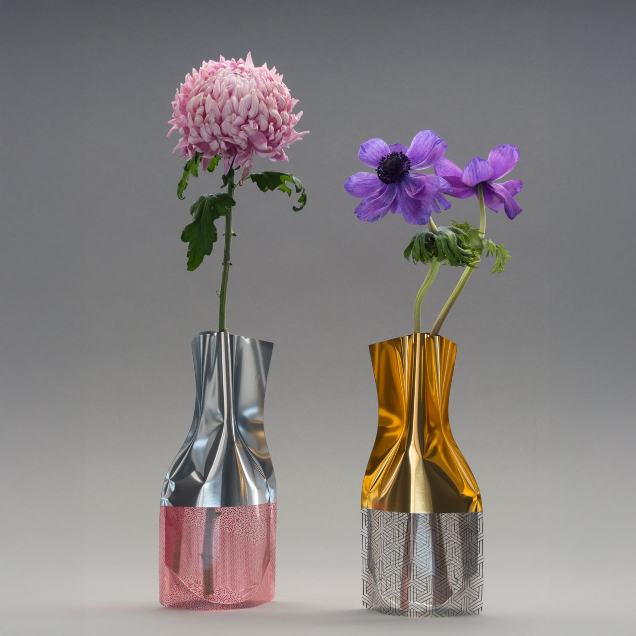 一見すると何気ないビニールパックのようですが、水を入れるだけで美しい花びんに変身する、ビニール製の花瓶です。水を入れた時の光の屈折が美しく、割れることもないため安全で、折りたたむと場所をとらずに収納できます。