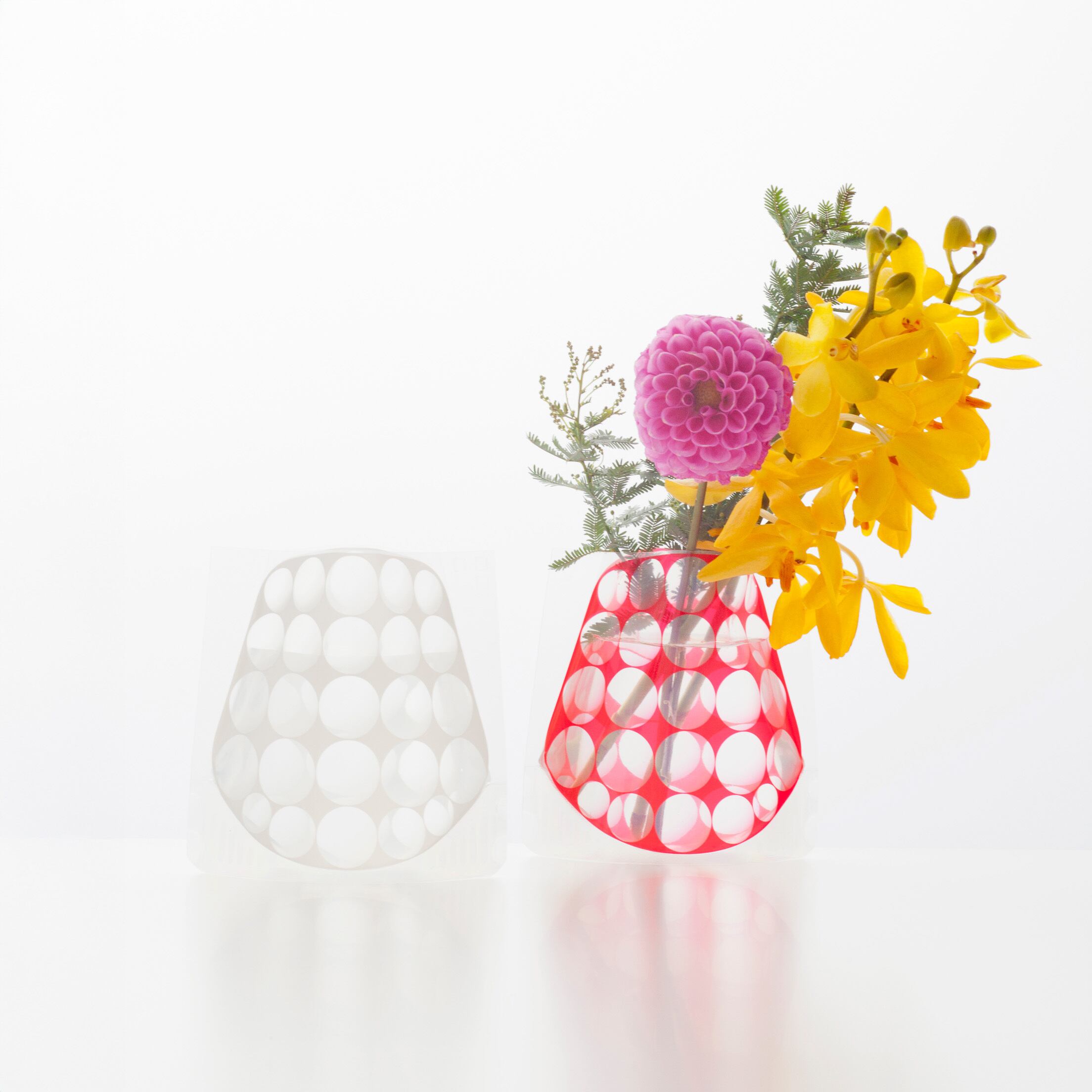 一見すると何気ないビニールパックのようですが、水を入れるだけで美しい花びんに変身する、ビニール製の花瓶です。ミニサイズはレギュラーサイズに比べ、高さが低く口が広いので、ミニブーケや背丈の低いお花を生けるのに適しています。