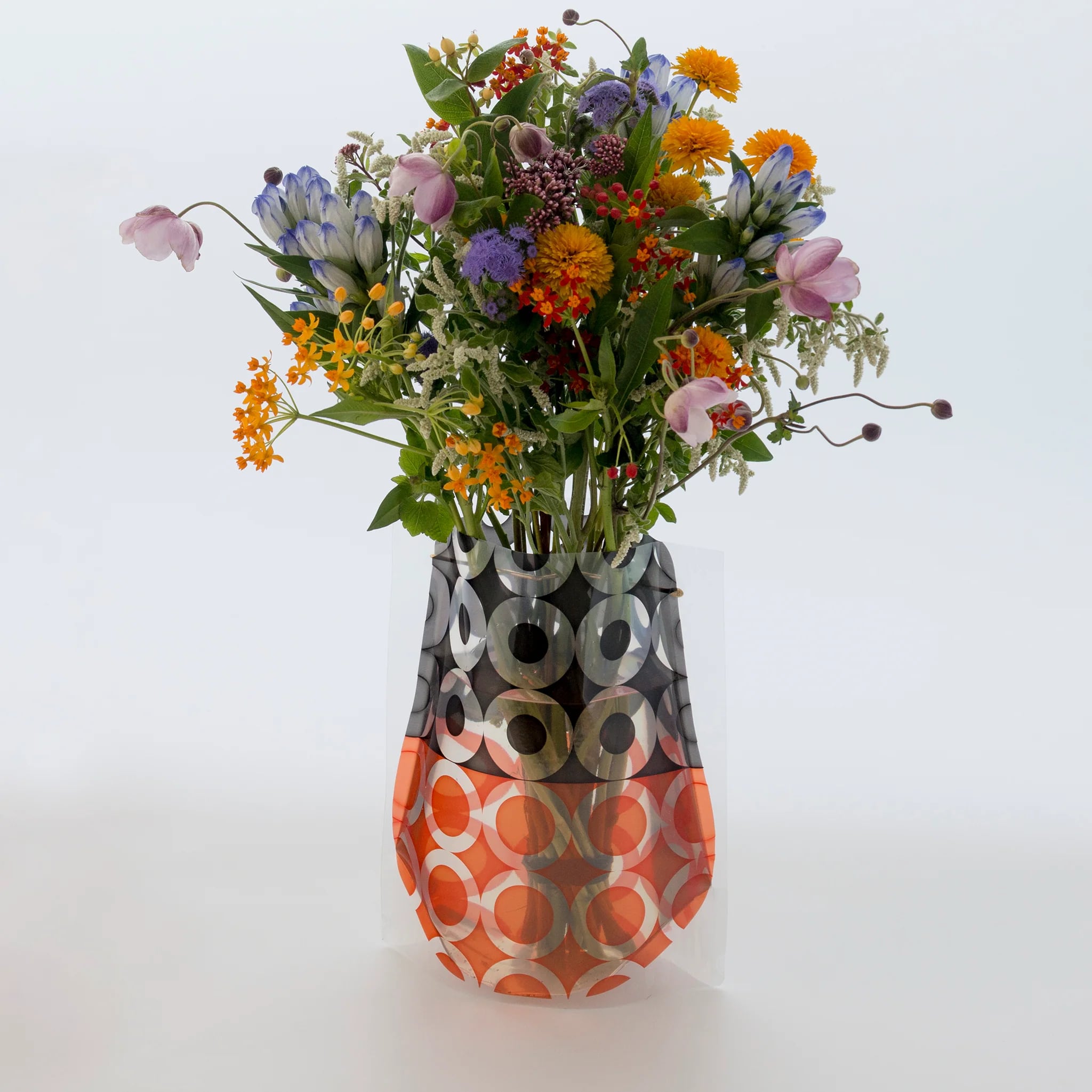 一見すると何気ないビニールパックのようですが、水を入れるだけで美しい花びんに変身する、ビニール製の花瓶です。大きな花束もたっぷり生けることができるラージサイズは、他のフラワーベースよりも厚手のビニール素材を使用し、花を生けやすくするための補助金具もついています。