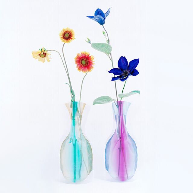 一見すると何気ないビニールパック。 水を入れるだけでぷくっと膨らみ美しい花瓶に変身します。 割れることがないので小さなお子様もご使用いただけます。折り畳むと場所をとらずに収納もできてとても便利です。 ひとつのパッケージに2種類入っているので、気分やお部屋の雰囲気に合わせて着せ替え感覚でお楽しみ下さい。 プチギフトにもおすすめの一品です。