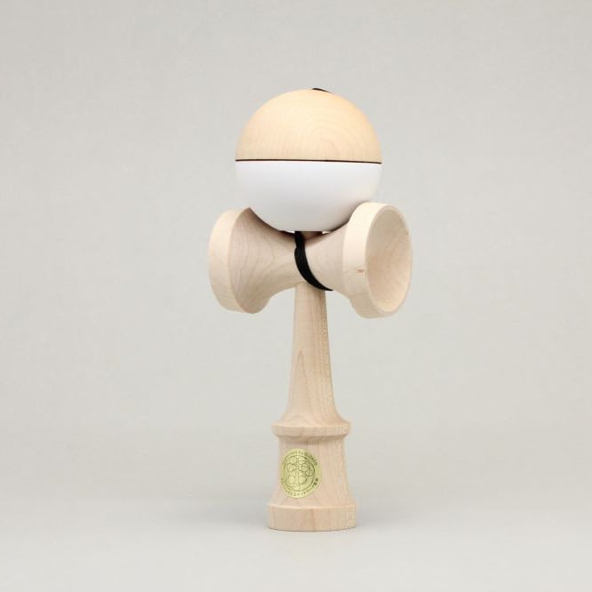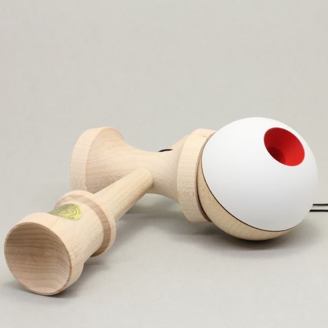 ’JAPAN’では、けん玉で最も穴が見やすいと言われている白を穴周りに配し、木地と白のハーフスプリットになっている。境には1本のレーザーで刻まれた線。穴には鮮やかな赤と、メリハリのあるデザインが施され、それらをバランスの良いとまり具合のSteam Coatingが包んでいる。これにより玉の回転の視認性が高くなるだけでなく、穴位置の把握もしやすくなり、メイク率を向上。素材はけん、玉ともにハードメープル材を使用。